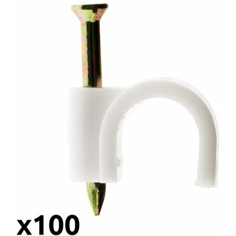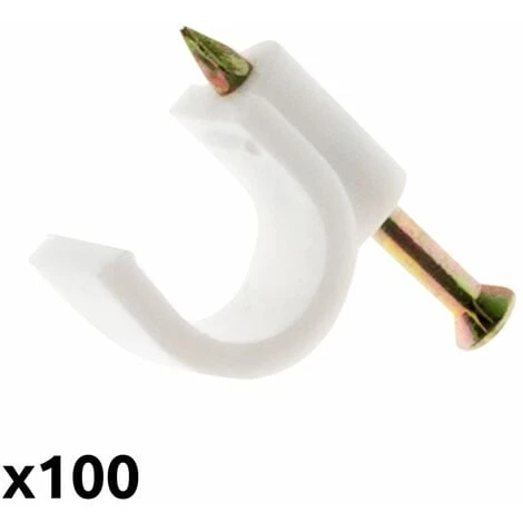 Lot de 100 attaches ou crochets de fixation blancs pour fil de diamètre 10mm avec clou spécial béton. Ces crochets permettent de fixer des câbles et autres gaines au mur. Certifié CE.