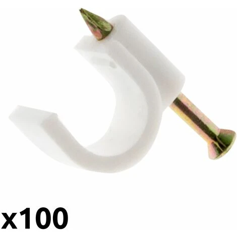 Lot de 100 attaches ou crochets de fixation blancs pour fil de diamètre 7mm avec clou spécial béton. Convient particulièrement aux câbles TV. Ces crochets permettent de fixer des câbles et autres gaines au mur. Certifié CE.