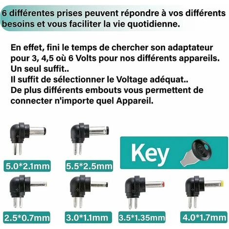 Vous avez perdu le câble d’alimentation d’origine ou vous voyagez avec plusieurs appareils ? Inutile d’emporter tous vos câbles d’alimentation individuels grâce à ce bloc d’alimentation universel adaptable.En effet, fini le temps de chercher son adaptateur pour 3, 4,5 où 6 Volts pour nos différents appareils. Un seul suffit.. Il suffit de sélectionner le Voltage adéquat.. De plus différents embouts vous permettent de connecter n’importe quel Appareil.