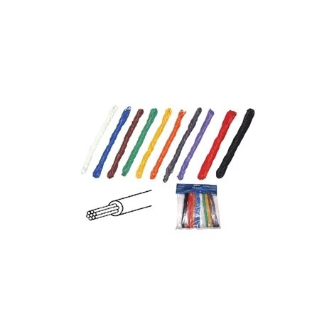 5 mètres de chaque pour les couleurs : blanc bleu brun vert jaune orange gris et violet + 10 mètres de chaque pour les couleurs : noir et rouge. Ø 02mm²
