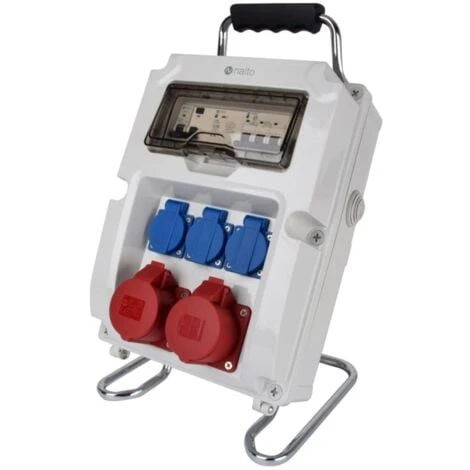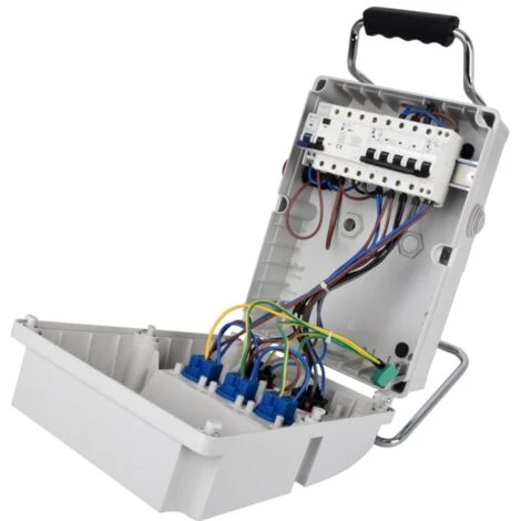 Ce coffret de chantier muni de son support métallique et de sa poignée de transport s’installe très facilement au sol. Il est équipé d’un interrupteur différentiel tétrapolaire 400V 30 mA 40A, d’un disjoncteur tétrapolaire 16A 400V, d’un disjoncteur 16A 230V et d’un arrêt d’urgence. Câble de branchement au réseau triphasé de votre installation non fourni.