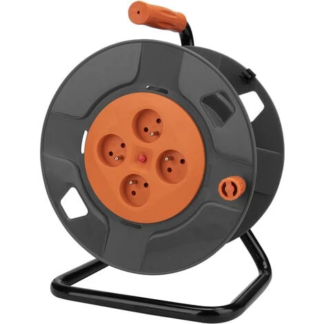 Enrouleur de bricolage équipé de 4 prises 2P+T 16A et d’un coupe circuit thermique. Non câblé et prévu pour une capacité de 40m en HO5VV-F 3G1,5mm². Avec platine Fixe. Puissance max déroulé 3000W et enroulé 800W sous 230V~.