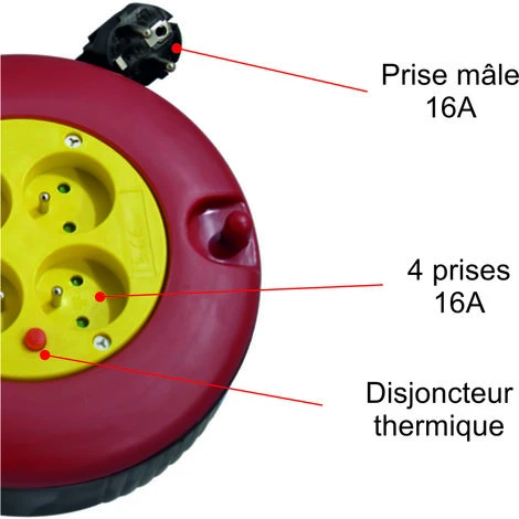 Cet enrouleur électrique d’une longueur de 5m (câble H05VV-F) est équipé de 4 prises 16A avec disjoncteur thermique et protection enfant. Robuste et fonctionnel, il est équipé d’une poignée ergonomique et d’un socle en métal pour une meilleure stabilité et solidité.
