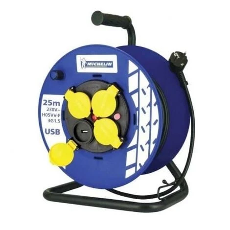 Enrouleur rallonge électrique longueur 25m avec 3 prises 2P+T 16A et 1 prise USB avec cable souple H05VVF 3G1.5mm² clapet gamme BRICO & GARAGE MICHELIN M41P63
