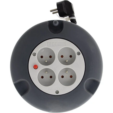 Enrouleur domestique 4 prises 2P+T 16A. Dispose d’un coupe-circuit thermique 16(6)A sous 250V. Puissance maxi sous 230V: 1000W (enroulé) – 3500W (déroulé). Câble: H05VV-F 3G1,5 mm (4m).
