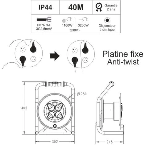 Enrouleur rallonge PRO de chantier IP44 – platine fixe (anti twist) – câble de 35m H07RN-F 3G2.50 mm² – 4 prises 16A IP44