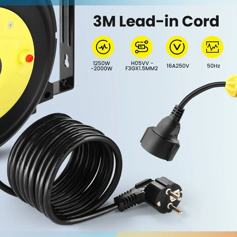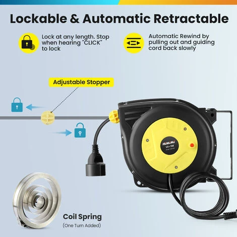 - 【 Rétractable Automatique 】 Avec un mécanisme intelligent d’enroulement automatique pour éviter les plis et les enchevêtrements, l’enrouleur de cordon d’alimentation se rétracte rapidement et en douceur ; le système à cliquet bloque le cordon à n’importe quelle longueur ; l’enrouleur de cordon est également muni d’une butée réglable.