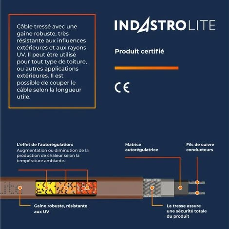 IndAstro Lite est un câble chauffant autorégulant, fabriqué selon les normes industrielles, qui peut être utilisé pour la protection contre le gel et le maintien en température des canalisations et des réservoirs, ainsi que pour la protection contre la neige et la glace dans les gouttières. La puissance de chauffage s’adapte automatiquement à l’objet à chauffer en fonction de la température ambiante. Grâce à sa propriété d’autorégulation, le câble chauffant ne peut pas surchauffer, même s’il est posé en chevauchement. Cela garantit une sécurité et une fiabilité maximales.