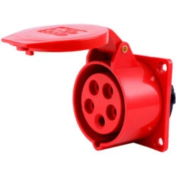 Prise industrielle conforme à la norme IEC-60309 (les broches sont identifiées par couleur). Série de prises industrielles rouges pour tensions de 380-415V.