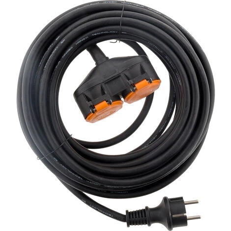 Rallonge 2 prises 2P+T IP44 H07RN-F 3×1,5mm² 5m avec clip de fixation orange. Cette rallonge de 5m 2P+T est prévue pour un usage extérieur avec sa protection IP44. Cable H07RN-F 3G1,5mm² et clip de fixation orange. Idéale pour les appareils électriques reliés à la terre (nettoyeur haute pression, pompe de piscine, éclairage extérieur).